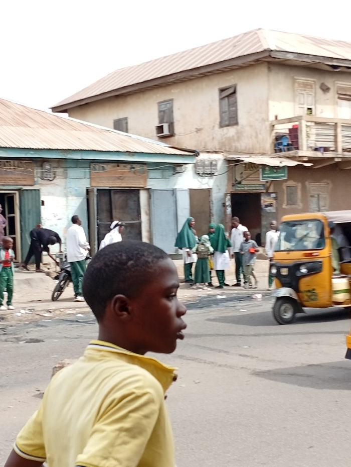 The image displays an urban street scene in the city of Gawuna, Nigeria, under daylight conditions. In the foreground, a young Black male, appearing approximately 8-12 years old, is captured in profile, facing right. He wears a yellow polo shirt with a dark-trimmed collar and sleeves; his mouth is slightly open. He stands on an asphalt road exhibiting minor cracks and debris. In the midground, a diverse group of individuals is observed. To the left, a child in a green and white school uniform is visible near a man attending to a black motorcycle. Further right, a light blue, single-story building with a corrugated metal roof features multiple dark, closed doorways and indistinct signage. Adjacent to this, several adults, including men in white shirts, and a group of young females, presumably students, are gathered. These females are uniformly dressed in green hijabs and long green garments, some carrying bags. In the background, a two-story, light brown building with a corrugated metal roof is prominent. This structure exhibits weathered walls, multiple wooden-framed windows, some with closed shutters, and an external air conditioning unit mounted on the second floor. A small balcony with a metal railing, draped with items, is also visible on the second floor. On the right side of the street, a yellow and black Bajaj Keke Napep (auto-rickshaw) is partially visible.