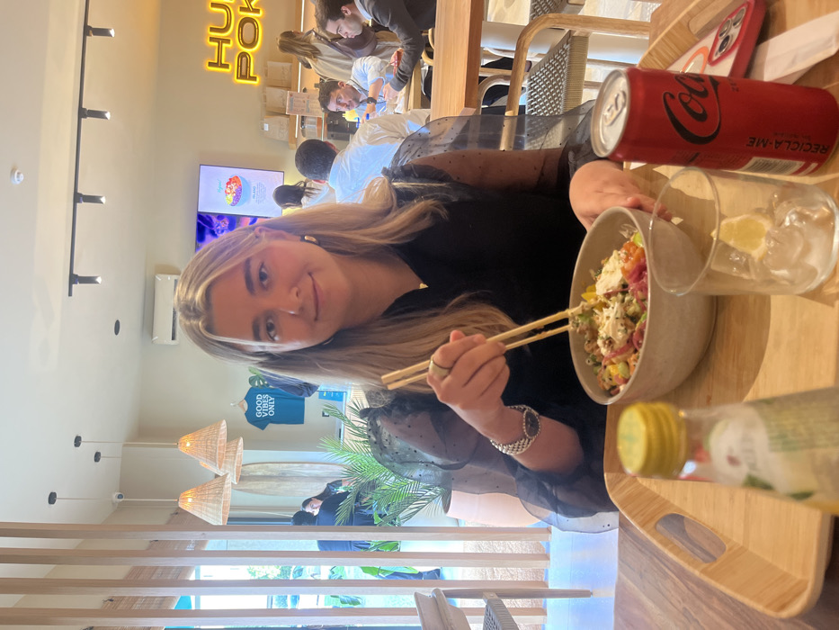 A young adult female is seated at a light wooden table inside a Hug Poke restaurant, located in Porto, Portugal