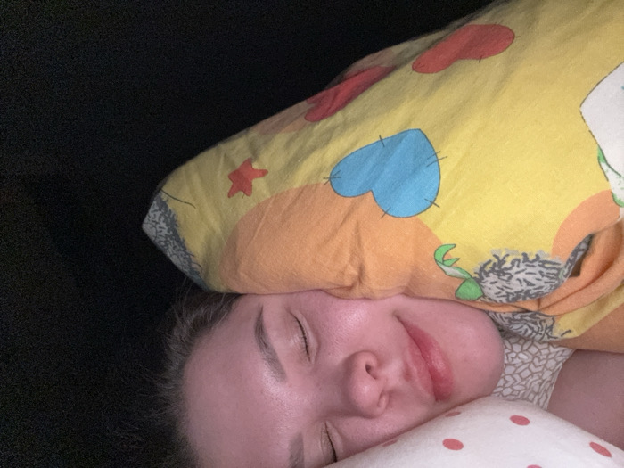 The scene, presented as occurring in Nizhnekamsk, Russia, depicts an indoor environment under low light conditions. A single individual, identified as female, is shown lying down, with eyes closed, consistent with a state of sleep or repose. A subtle smile is present on the subject's lips. Her head rests on a light-colored pillow, possibly white or beige, featuring a faint geometric pattern. A second pillow, encased in a yellow pillowcase, is positioned partially over the subject's forehead and the top of her head. This yellow pillowcase is adorned with multi-colored patterns, including a blue heart, red star-like shapes, and a grey, textured animal figure with green elements. An orange textile material, consistent with a blanket or duvet, is visible adjacent to the yellow pillow. To the lower right, a white surface with distinct red polka dots, consistent with another pillow or bedding item, is partially visible. The background is uniformly dark and featureless.