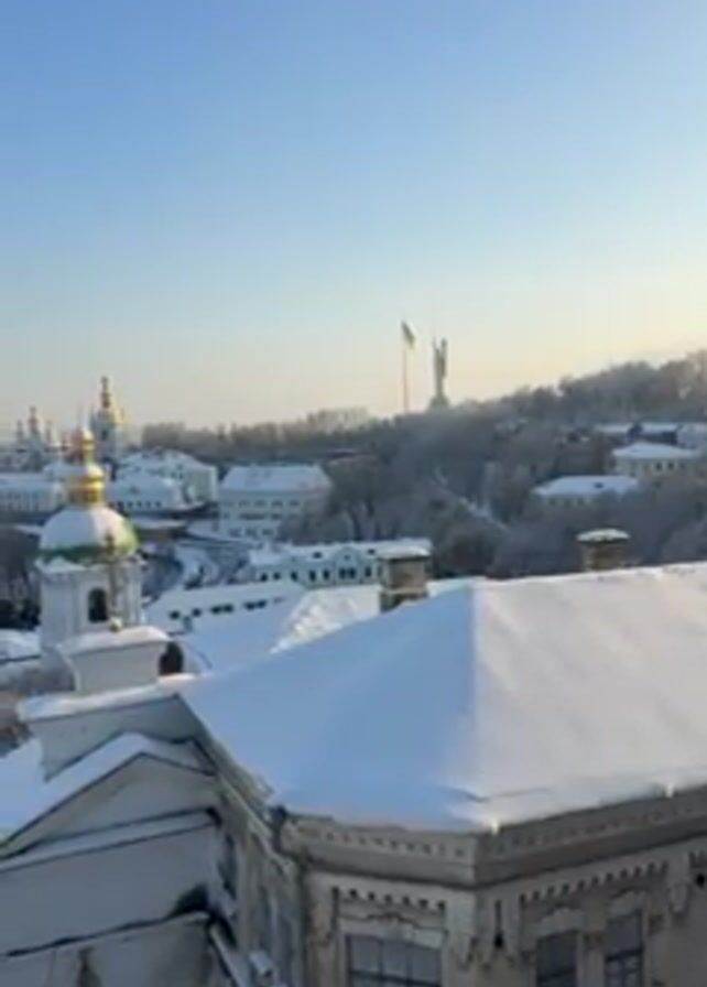winter scene, likely in Kyiv, Ukraine. The foreground is dominated by a light-colored building with snow-covered rooftops. In the background, multiple buildings with golden domes, likely part of a monastery or cathedral complex, are visible, also covered in snow. In the far distance, a large statue with a Ukrainian flag can be seen atop a snow-covered hill. The sky is clear and blue, suggesting a sunny winter day. No people or animals are visible in the frame.