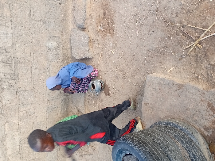This image depicts an outdoor scene in Ayama, Nigeria. In the foreground-left, a young boy in a black long-sleeved shirt with red accents, black pants with red side stripes, and light-colored shoes is in motion, walking from left to right. He holds a dark object in his right hand, and a green item is visible behind his left shoulder. To the right, a young girl, wearing a light blue hijab, a light blue tunic, and a patterned dark skirt, squats on the dry, light brown ground, facing left. A grey, spouted pot-like vessel with liquid residue is positioned on the ground directly in front of the squatting girl. In the lower-left, two dark vehicle tires are stacked. The ground is a mix of packed dirt and scattered organic debris, including small sticks. Several irregular, light grey concrete slabs are also present on the ground. The background features a light-colored concrete block wall with visible mortar lines and faint markings.