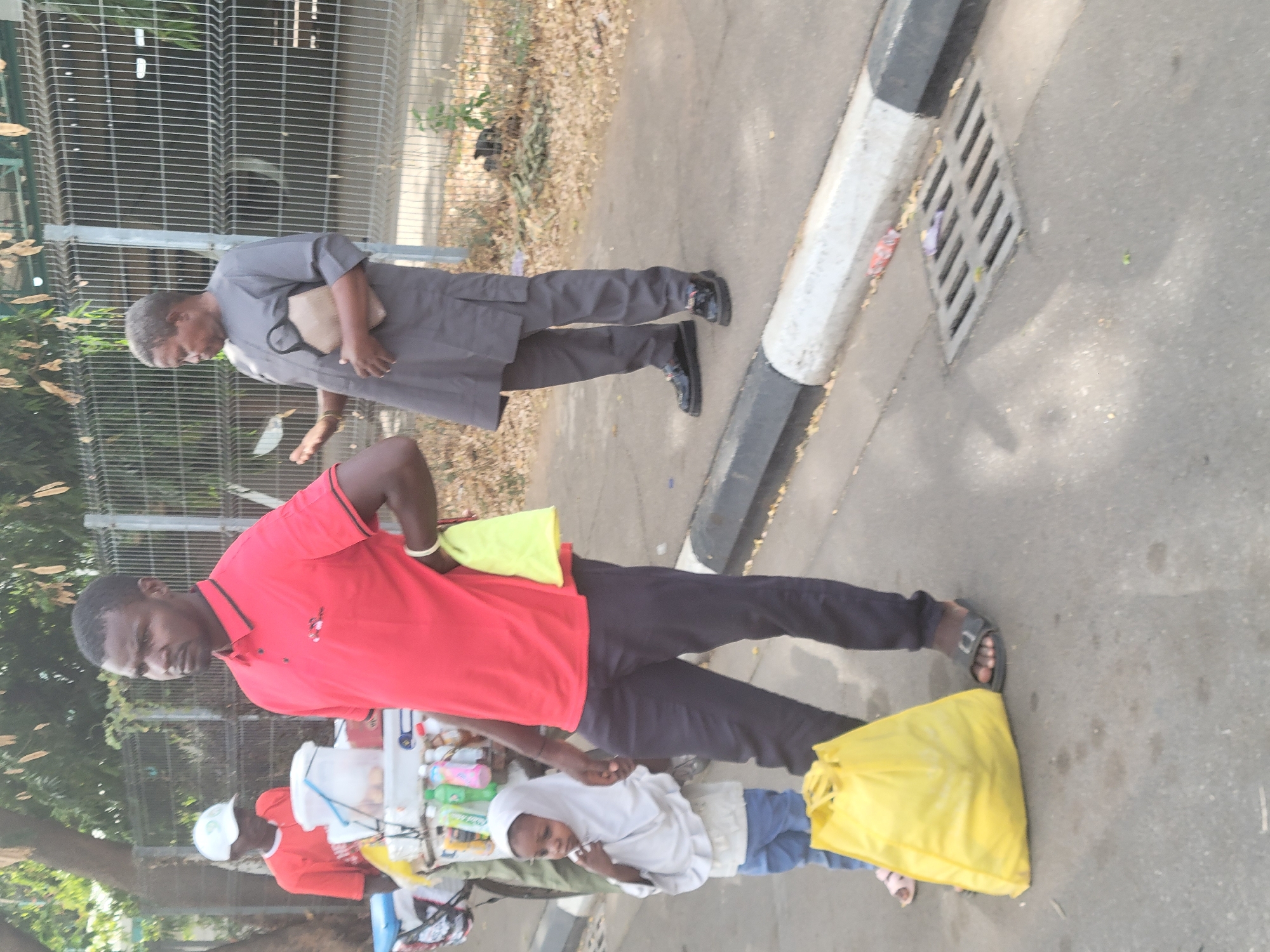 The image depicts an outdoor scene on what appears to be a sidewalk in Abuja, Nigeria. The ground is asphalt. Two men are walking. One man is wearing a grey suit and carrying a bag. The other man is wearing a red t-shirt and black pants. He is selling beverages and other items from a mobile vending cart. A child in a white headscarf is also visible. A yellow plastic bag sits on the ground. A metal grate and curb are also visible in the background. There is a fence on the side.