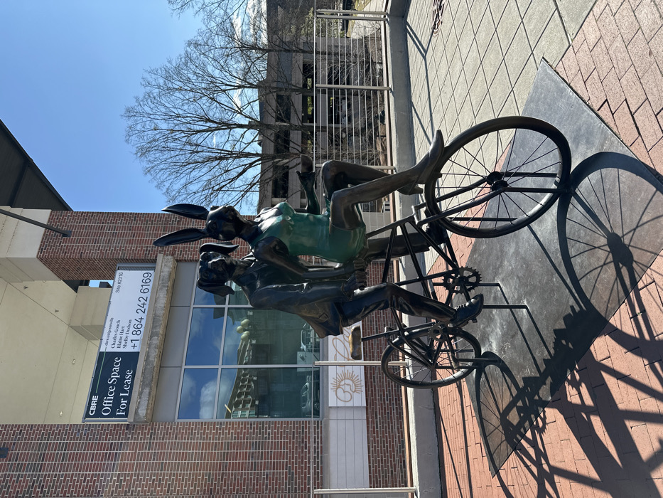 A bronze statue depicts two anthropomorphic rabbits on a bicycle. One rabbit, wearing a suit, pedals the bike, while the other, in a green dress, reclines. The statue casts a shadow on a brick-paved sidewalk. In the background is a brick building with an "Office Space For Lease" sign, prominently displaying contact information, including the phone number +1 864 242 6169. The sky is a clear blue with bare trees in the distance.