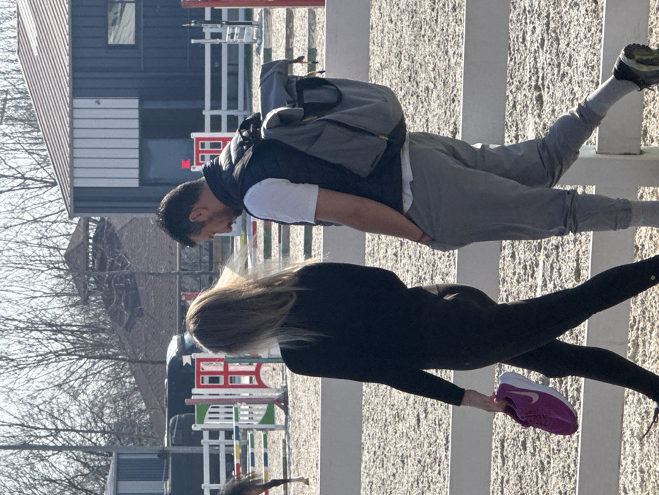 The scene depicts an outdoor equestrian facility in Duvanlii, Bulgaria, under clear daylight conditions. Two individuals, an adult female and an adult male, are walking from left to right across the frame. The female, positioned slightly closer to the camera and to the left, has long, light-colored hair, which appears windblown. She is dressed in a black long-sleeved top and black leggings. In her right hand, held at her side, she carries a single bright purple athletic shoe with a white sole and a white Nike swoosh. Her head is turned slightly to her right, and her back is mostly to the camera. The male, positioned to the right of the female, has short dark hair and a beard. He is wearing a white short-sleeved t-shirt, a dark blue or black quilted vest, and light grey track pants/joggers. He wears a grey roll-top backpack with yellow accents over his vest. His hands are in his pockets, and a red band is visible on his left wrist. He wears light-colored socks and dark sneakers on his visible left foot. His head is turned downwards and to his left. Both individuals are walking on a light-colored, possibly sand or gravel, ground within a fenced arena. In the background, an equestrian arena is visible with white perimeter fencing and colorful obstacles/jumps featuring red, white, green, and blue elements. The hindquarters and tail of a dark-colored horse are partially visible on the far left, near a jump. Beyond the arena, bare deciduous trees are prominent. Two buildings are present: a dark-colored metal-clad structure with a red marking near an entrance and a window, and another building with a brown shingled roof featuring a small cupola or tower structure.