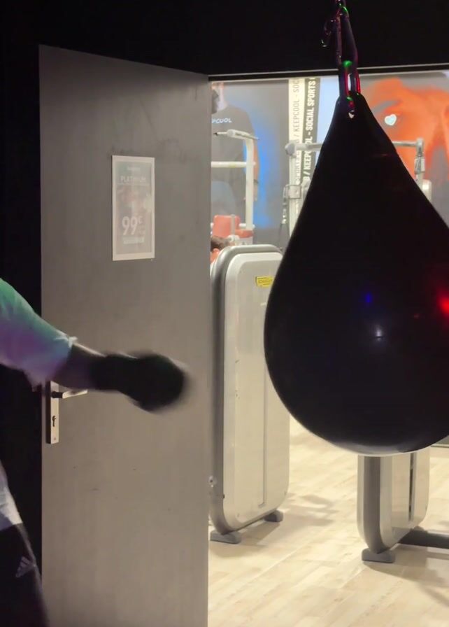 A person wearing a white shirt and black shorts is shown punching a black teardrop-shaped punching bag. The bag is hanging from a chain in a gym with a door visible in the background. A poster on the door indicates a platinum membership price. The gym equipment and interior can be seen through the open doorway. The person is wearing black gloves and continuously punches the bag with both hands.