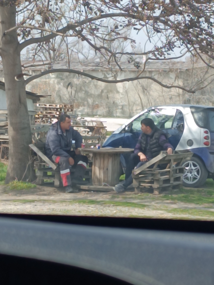 The scene depicts an outdoor gathering of two adult males in Katunitsa, Bulgaria. In the foreground, the lower portion of a dark car interior or dashboard is visible, suggesting the image was captured from within a vehicle. On the left, a large deciduous tree with bare branches anchors the scene. To its right, two men are seated at a makeshift table and benches constructed from wooden pallets. The man on the left wears a dark jacket and dark trousers with a red and white stripe on the lower left leg. He faces towards the right. The man on the right wears a dark puffer vest over a patterned long-sleeved shirt and dark trousers. He faces towards the left. Between them is a round, wooden spool-like table on which two cups (one red, one blue/white) are placed. Behind the man on the right, a blue and silver Smart Fortwo car is parked. Further in the background, stacks of wooden pallets are visible, along with a building featuring a grey, textured wall and a visible roofline. The ground is a mix of dirt and sparse grass. The sky is light blue with some haze. The men appear to be engaged in conversation.