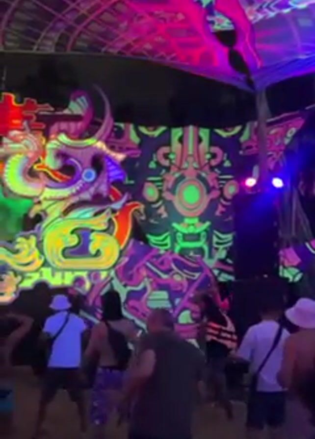 crowd of people dancing at a party, likely an outdoor music festival or rave. The scene is set at night, with bright, colorful, psychedelic designs lit up on a stage behind the crowd. The designs are intricate and abstract, glowing with neon-like colors. People in the crowd are wearing casual summer clothing, some with hats and bags. They are moving to the music, and the overall atmosphere is lively and energetic. The light from the stage illuminates the crowd, creating shadows and adding depth to the scene. A complex, woven roof structure overhead is lit with various colors, adding to the psychedelic ambiance.
