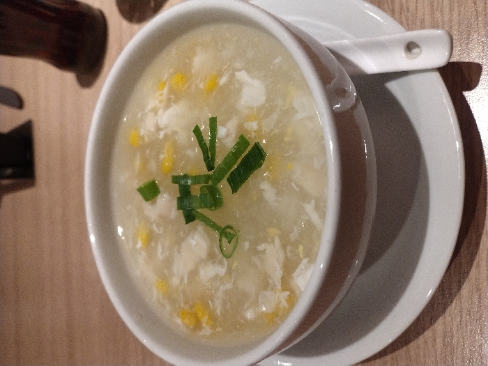 A bowl of egg drop soup sits on a white saucer. The soup, light yellow and opaque, contains visible pieces of egg and kernels of corn. Green scallions garnish the top. A white ceramic spoon rests on the saucer, near the bowl. The table is a light brown wood. Parts of condiment containers are visible in the background.