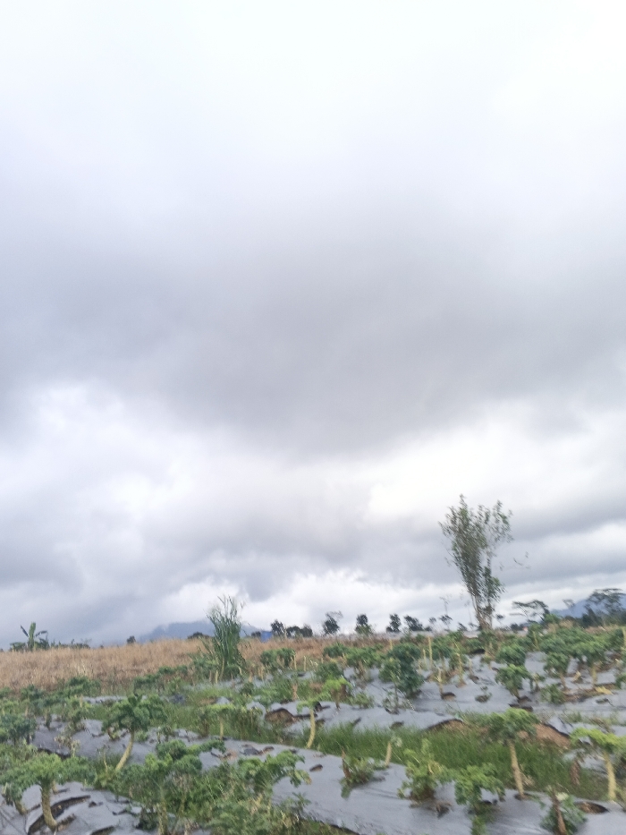 The scene depicts an agricultural field located in Pô Kô, Vietnam, under an overcast sky. The foreground and midground feature cultivated land with numerous low-lying green plants or plant stumps arranged in rows, growing through black plastic mulch which covers the ground. Patches of green grass and weeds are visible around the plants and between the mulch sheets. In the midground, to the left, are banana plants, and to the right, a slender tree with light green foliage stands. Beyond the cultivated area, a band of dry, light brown vegetation stretches horizontally, followed by a distant line of dark green trees. The horizon reveals faint outlines of mountains or hills obscured by a dense, uniformly grey cloud cover that dominates approximately two-thirds of the upper frame. No individuals or animal life are visible.