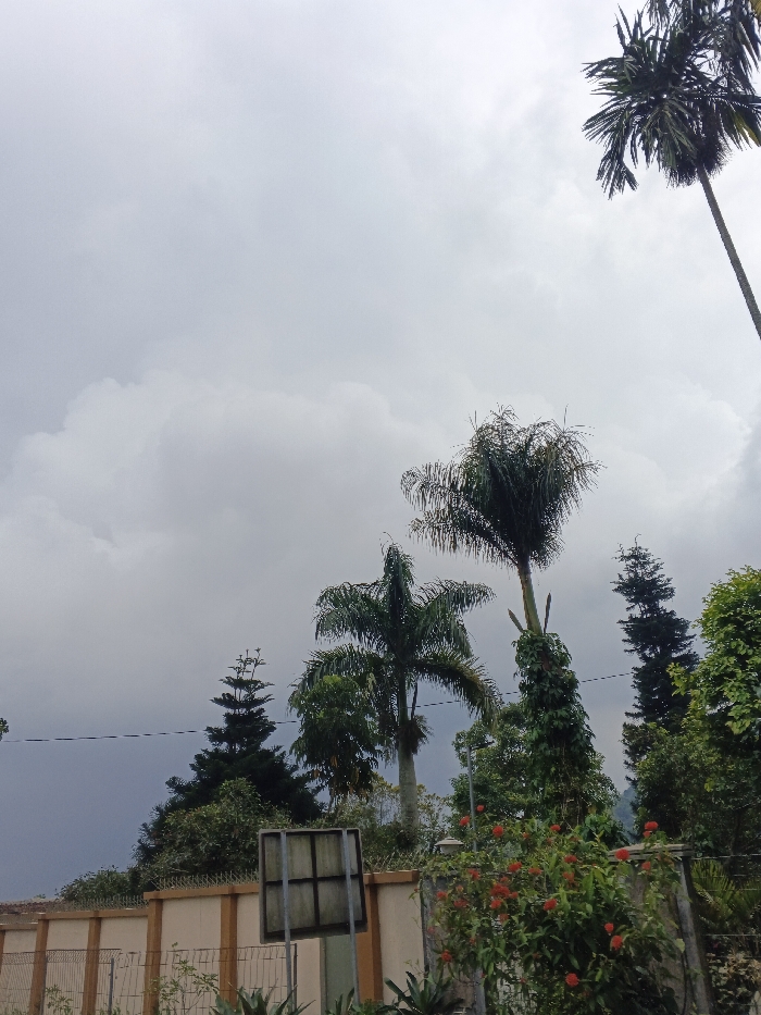 The scene depicts an outdoor environment in Vang Vieng, Laos, under a heavily overcast, grey sky with dense cumulus clouds. Darker cloud formations are visible in the lower-left background. Multiple trees dominate the mid-ground and background. A tall, slender palm tree extends from the upper right, mostly out of frame. Centrally, another palm tree with a fuller crown stands prominent, with a vine climbing its trunk. To its left, a third, shorter palm tree is visible. Further left and behind a wall, a tall, conical evergreen tree is present. In the lower right foreground, a dense green bush with clusters of small red blossoms is visible. A light-colored concrete wall, approximately 2 meters in height, with a darker trim along its top, traverses the mid-ground horizontally. The wall is topped with anti-climb deterrents, resembling spikes or barbed wire. A low metal fence runs in front of this wall. A dark, rectangular metal frame, possibly a sign support structure or a utility panel, stands vertically in the lower-middle left. A single horizontal utility line extends across the image above the wall. A small, white, globe-shaped lamp is affixed to the top of the wall on the right side. No human figures or animals are present in the image.
