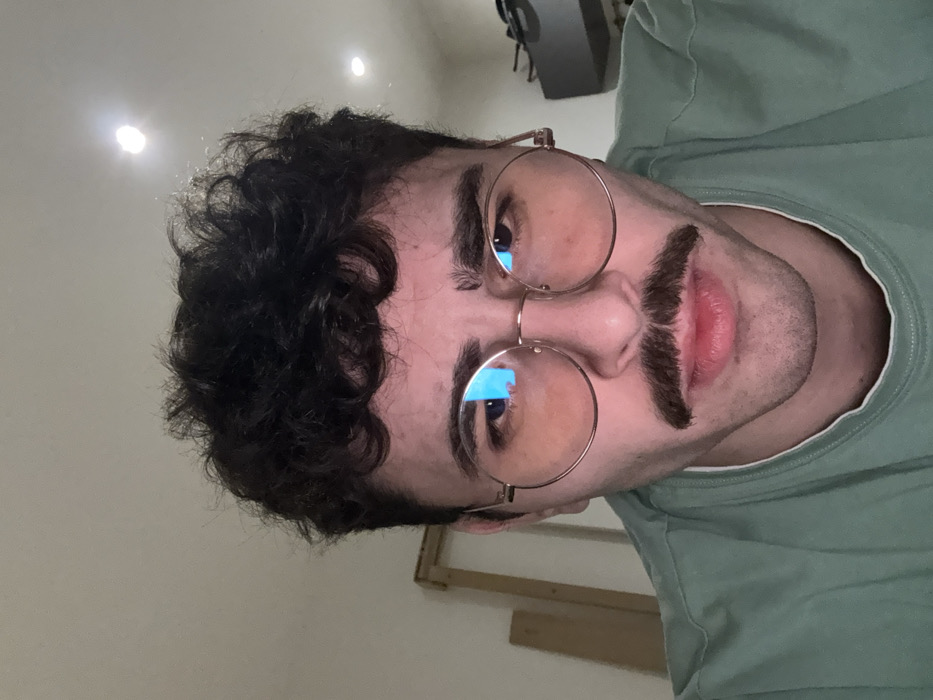 A person with curly, dark hair poses wearing round glasses and a fake, dark mustache. The individual sports a light green t-shirt. The background is a plain, light-colored wall with what appear to be recessed lighting and a glimpse of a window frame. Reflections are visible in the lenses of the glasses. The image is rotated, giving a tilted perspective of the subject.