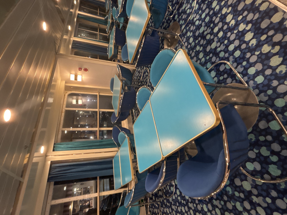 - "A line of light blue square tables with blue chairs sit on a blue patterned carpet" by FM-2VH5m1, licensed under CC BY 4.0