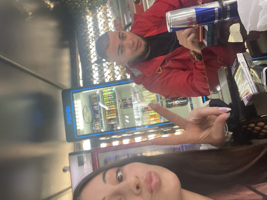 two individuals seated at a dark, reflective table inside a commercial establishment in Tvarditsa, Bulgaria, resembling a cafe or kiosk. On the left, a female subject is partially visible, showing her right eye, nose, and mouth, which is posed in a puckered gesture. She has long, dark hair and her right hand is raised, forming a two-finger "peace" (V) gesture. Her fingernails are painted a light, iridescent pink. On the right, a male subject with short, faded dark hair and light facial hair is seated, wearing a red hooded jacket over a black shirt. He is looking towards the camera with a neutral expression. A gold-toned watch is visible on his left wrist. The table in the foreground contains a black smartphone, a white pack of cigarettes with Bulgarian text ("Пушенето убива"), a black cigarette lighter, an upright blue and silver Red Bull energy drink can, and a small crumpled white piece of material. In the background, a prominently displayed, blue-illuminated Pepsi-branded refrigerated display cabinet is visible, stocked with various beverages in cans and bottles. To the left of the Pepsi cooler, a portion of another refrigerated unit with a red trim is visible. A small white security camera is mounted on the ceiling above this left-most cooler. To the right of the Pepsi cooler, a lattice-like structure covered with some green foliage is present. The ceiling above the scene appears to be light-colored and paneled.