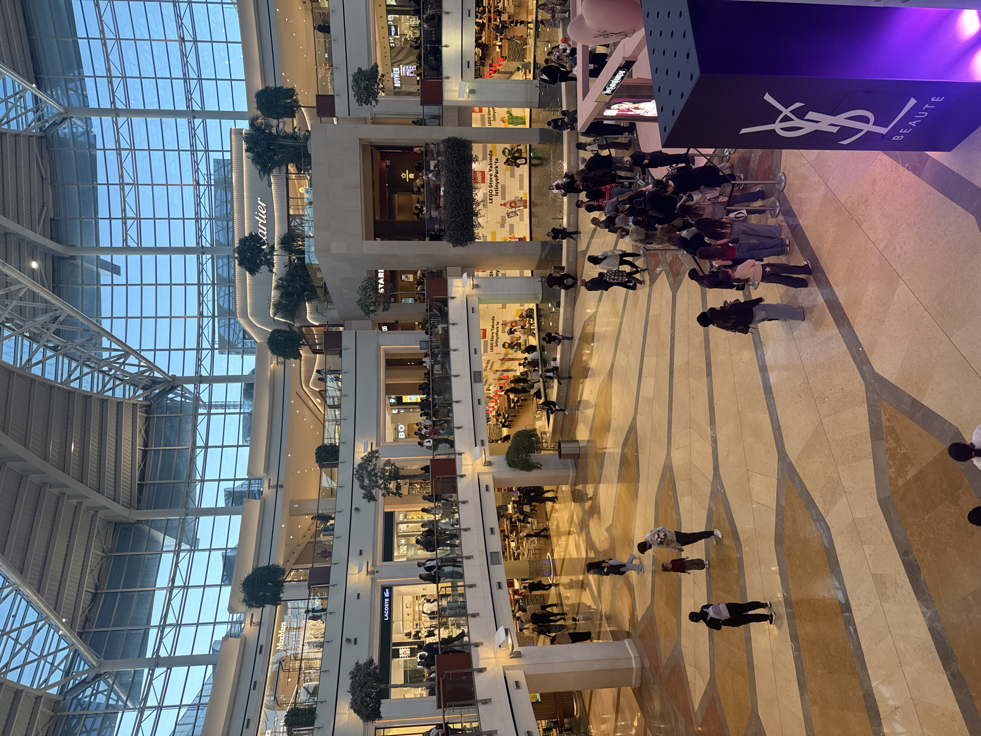 n indoor scene of a multi-story mall with a glass ceiling. Several stores are visible on multiple levels, including Lacoste, BO, Cartier, MaxMara and a LEGO store. A large crowd of people is gathered near a "YSL BEAUTE" promotional display. The location is a mall in Sarıyer, Turkey. People are walking around, browsing stores, and interacting with the promotional display. The environment is brightly lit with natural light from the glass ceiling and artificial lighting within the mall. The floor has a patterned design with alternating shades of beige.
