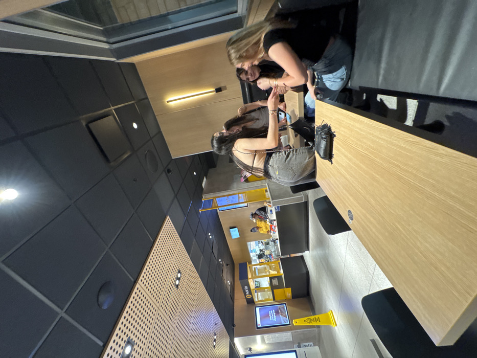 The image depicts the interior of a McDonald's restaurant, likely located in South Bend, United States. **Environment:** The space features a modern design with a dark, segmented ceiling containing recessed circular and linear lighting. A section of the ceiling on the left has a light-colored, perforated acoustic panel. Walls are primarily clad in light wood paneling, with some darker stone or concrete elements visible near a large window on the far right. The flooring consists of light-colored tiles in a grid pattern. In the mid-ground, a long, light wooden communal table with dark chairs on the left is present. A dark, upholstered booth runs along the right wall. Artificial lighting illuminates the entire scene, suggesting it is evening or night. In the background, a "Pick Up" counter in yellow and black is visible, along with additional service counters and digital displays. A yellow "wet floor" warning sign stands near the service area. **People and Interactions:** Four young females are seated at the booth and table on the right side of the image. 1. **Female 1 (standing):** Positioned partially behind the wooden table, facing towards the booth. She has long dark hair, wears a black backless top with thin straps, and light-colored denim jeans. She is holding a dark-colored smartphone in her left hand, extending it forward, possibly for viewing by the others. She wears bracelets on her left wrist. 2. **Female 2 (seated):** Partially obscured, she is positioned at the booth, looking towards Female 1. She has long dark hair and wears a light grey top. 3. **Female 3 (seated):** Positioned at the booth to the left of Female 4. She has dark hair, wears a dark top, and is smiling while looking towards Female 4, with her left hand near her mouth. 4. **Female 4 (seated):** Positioned at the booth on the far right. She has long blonde hair, wears a black top and light blue denim jeans. She is smiling and looking towards Female 3, with her right forearm resting on the table. A black fringed handbag rests on the wooden table in the immediate foreground. In the background, behind the service counters, two individuals, presumably McDonald's staff, are visible. One wears a yellow uniform top and a dark baseball cap; the other wears a dark uniform top and a baseball cap. They appear to be engaged in work-related tasks behind the counters.
