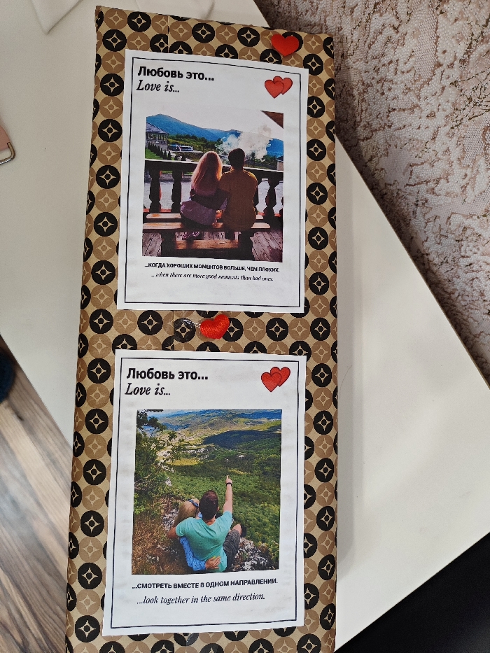 A gift wrapped in patterned paper features two framed photographs. Each photo is labeled "Love is..." in Russian and English. The first photo shows a couple sitting on a bench overlooking mountains, with the caption "...when there are more good moments than bad ones." The second photo shows a couple looking out over a scenic valley, with the caption "...look together in the same direction." Both photographs are decorated with red hearts.