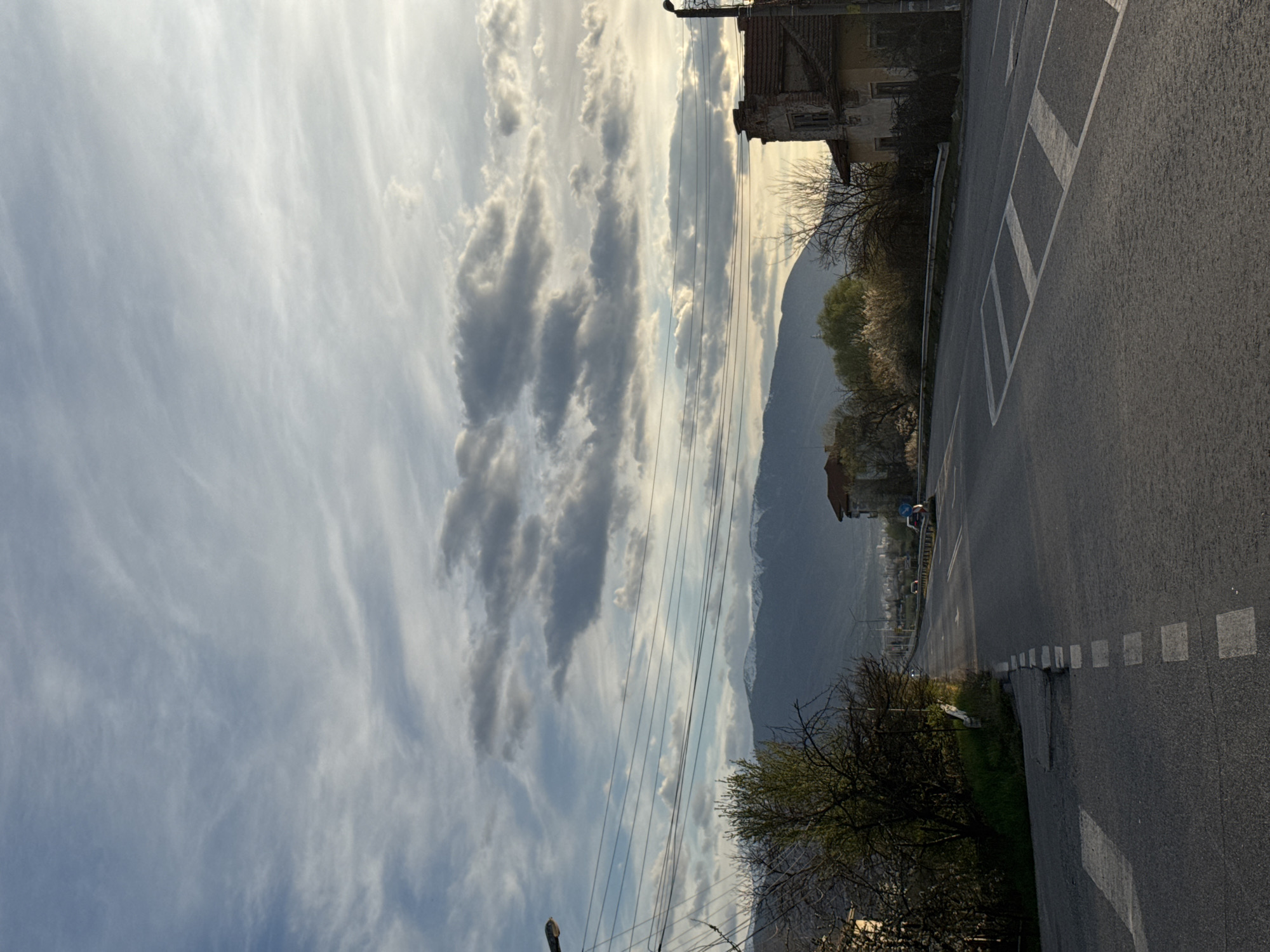 view from what appears to be a road in Iabalkovo, Bulgaria. The road is asphalt, with white lane markings. To the right of the road is a patch of green vegetation. Beyond the road, there are trees and buildings. In the background, a mountain range is visible, partially covered with snow. Above, the sky is filled with clouds, ranging from light wispy formations to darker, more defined cloud clusters. The photograph is taken in a vertical orientation.