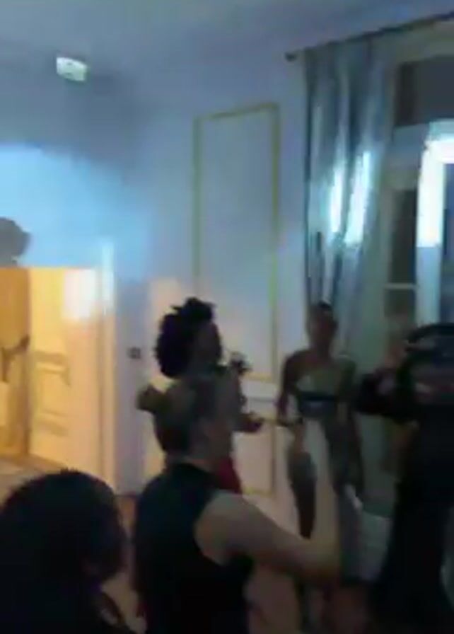 group of people dancing at a party. The lighting changes from pink to purple. A large chandelier hangs from the ceiling. The walls are white with gold trim. The dancers are dressed in dark clothing. Some are holding phones and recording. There are men and women present.