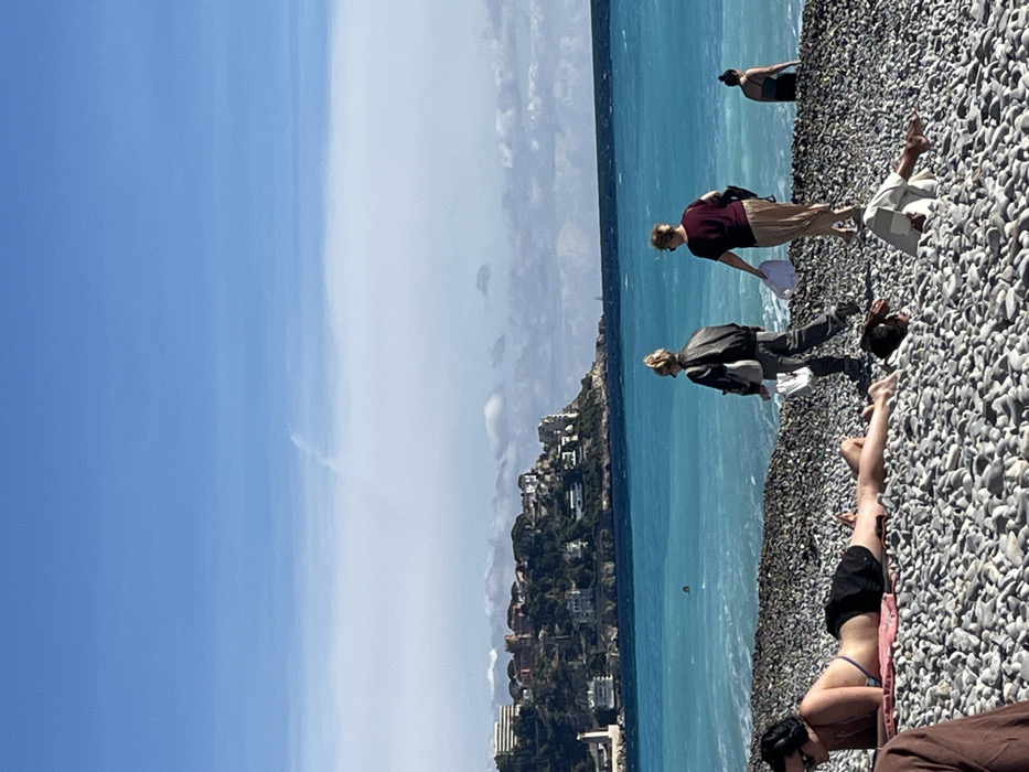 - "The image depicts a sunlit pebble beach scene in Nice, France, facing the Mediterranean Sea and the distant Cap de Nice promontory" by FM-eWTi73, licensed under CC BY 4.0