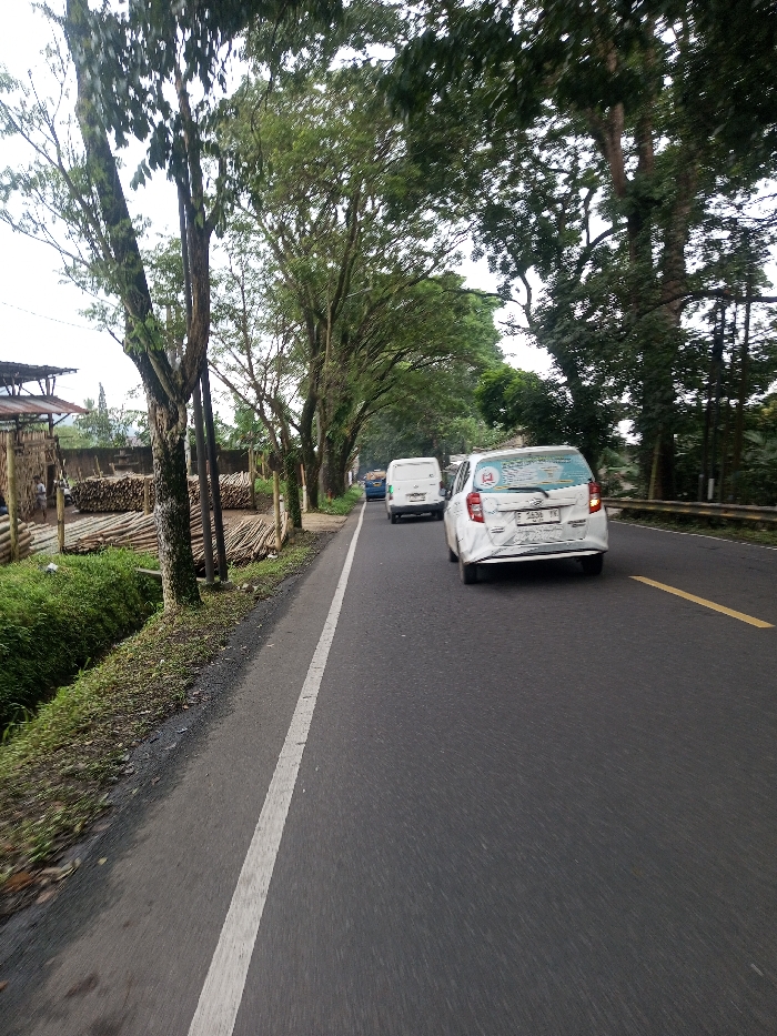 The image displays a road scene in Sandamal Eliya, Sri Lanka, under an overcast sky. The view is forward along an asphalt road with a solid white line marking the left edge and a broken yellow line further right, indicating traffic lanes. Three vehicles are visible in succession, moving away from the viewer. The closest is a white hatchback, featuring a rear license plate displaying "F 1636 YK", along with visible dirt or damage on the rear bumper and multiple stickers on its rear window. Behind it is a white van, followed by a partially obscured dark-colored sedan. To the left of the road, a grassy verge and a dense line of tall trees with green foliage are present. Beyond these trees and vegetation, a structure with a corrugated metal roof is visible, alongside large, horizontal stacks of cut wood or bamboo poles. A faint human figure is discernible near this processing or storage area. Utility poles stand interspersed among the trees. On the right side of the road, a metal guardrail is partially visible through dense foliage.