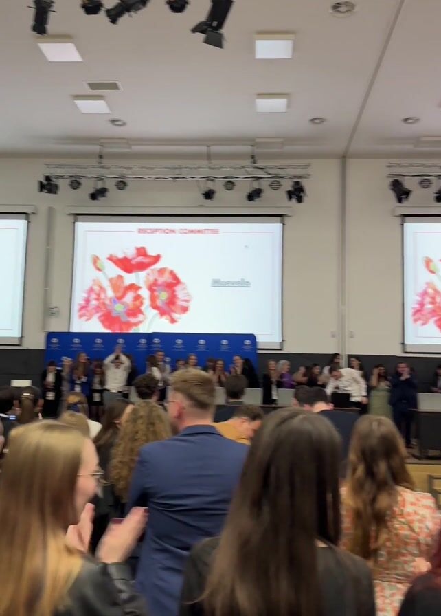 large room with two projector screens displaying a presentation slide titled "Reception Committee" with an image of red poppy flowers and the name "Muvela." The audience is seated and applauding enthusiastically. Individuals are of varying ages and ethnicities. The room is brightly lit by overhead lights, and there is a lighting rig above the stage area. People are dressed in formal and semi-formal attire, with some wearing suits and dresses. A blue wall with vertical blinds is visible in the background. The video pans slightly across the room, showing the extent of the audience and the general atmosphere of the event.