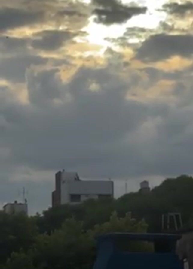 cloudy sky with the sun peeking through. Below, there is a line of green trees, and in the distance, there are a few white buildings with antennas. In the foreground, there is a blue rooftop structure. A crow can be heard.