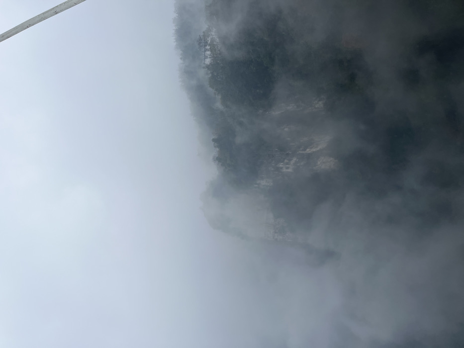 A misty mountain slope is partially visible. Dense fog obscures the majority of the landscape, with only the upper portion of the cliff and some trees showing through the haze. The fog's density varies, creating different shades of gray, suggesting depth. In the top left, a cable is also visible, likely a part of a cable car or other aerial system.