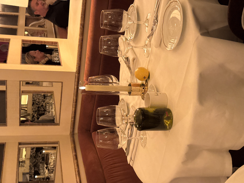 A restaurant table with a white tablecloth features place settings, including wine glasses, plates, and silverware. A green wine bottle and a candle in a glass holder are centered on the table, with a lemon nearby. The table is set against a plush, curved red seat. Mirrored panels on the wall reflect the diners and other tables in the restaurant, creating a repeating visual effect.