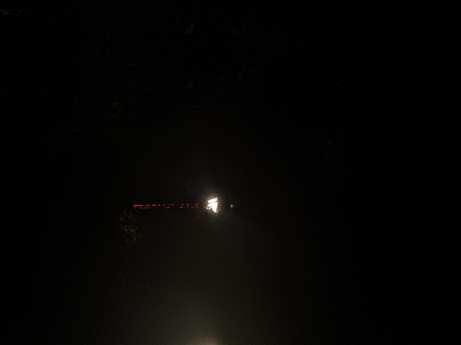 A dark, night scene reveals a single, bright light piercing through the darkness. Adjacent to the light, a horizontal line of red dots suggests distant lights, possibly from vehicles or structures. The surroundings are shrouded in darkness, hinting at foliage or trees. The scene is likely outdoors, with an impression of depth created by the varying brightness levels. The dominant darkness amplifies the impact of the artificial light sources.