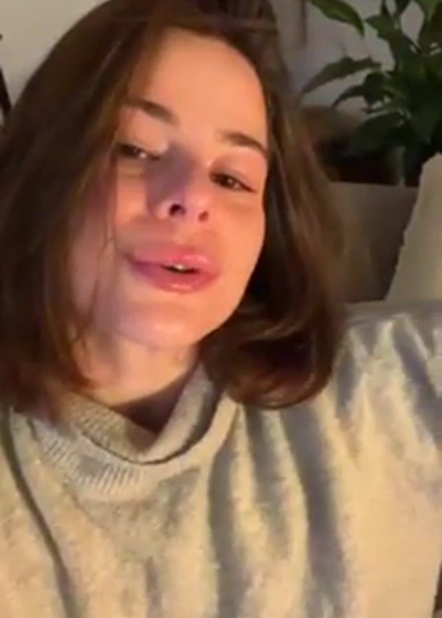 A person with medium-length brown hair, wearing a gray turtleneck sweater, holds their hand up to their face as if blowing a kiss towards the camera