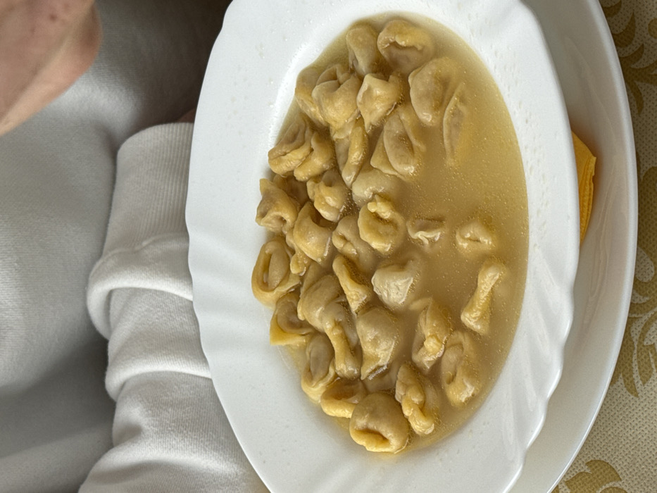 - "A close-up, high-angle shot depicts a white fluted ceramic bowl containing numerous tortellini submerged in a clear, light amber-colored broth, centered on a dining surface" by FM-8gYMf1, licensed under CC BY 4.0