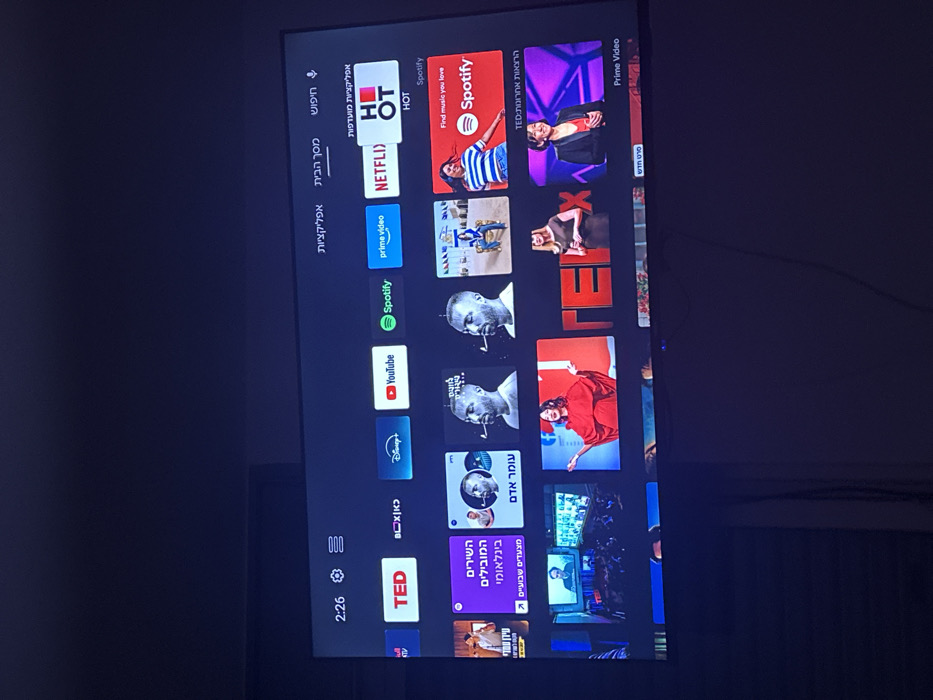 A dark, indoor scene captures a smart television screen displaying its interactive home interface, located in Rishon LeZion, Israel