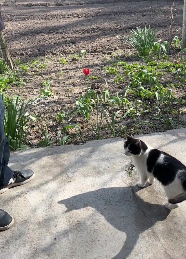 A person stands near the edge of a concrete patio that overlooks a newly plowed garden. They are wearing dark blue jeans and black and gray shoes. A black and white cat with a long tail looks up at the person. The cat sits down and looks at the person’s leg. Behind the patio is a plowed garden and some vegetation including a few tulips in bloom. In the distance are some houses and a chain link fence.