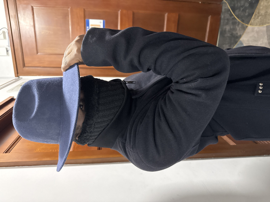 The image depicts an individual indoors within Daxing District, China. The subject, whose gender is unidentifiable, is partially obscured, wearing a dark blue, wide-brimmed felt fedora-style hat pulled low, and a black knitted face covering that conceals the lower face and neck. The face covering features a ribbed exterior texture and a visible soft, possibly fur-lined, trim around the eyes. A dark-colored (likely black or navy) coat or jacket is worn, displaying a ribbed collar, a metallic zipper pull on the right side of the chest, and three small, vertically aligned metallic studs or buttons on the lower left side. The individual's right hand is raised, grasping the brim of the hat. A single eye is partially visible between the hat brim and the face covering. The background includes a light-colored wall on the left and a wooden door on the right, which has vertical panels. A white rectangular object is mounted on the wall above the door, and a blue and white rectangular sign or sticker is affixed to the door. The floor, partially visible at the bottom, is dark, reflective, and features a light-colored, abstract design.