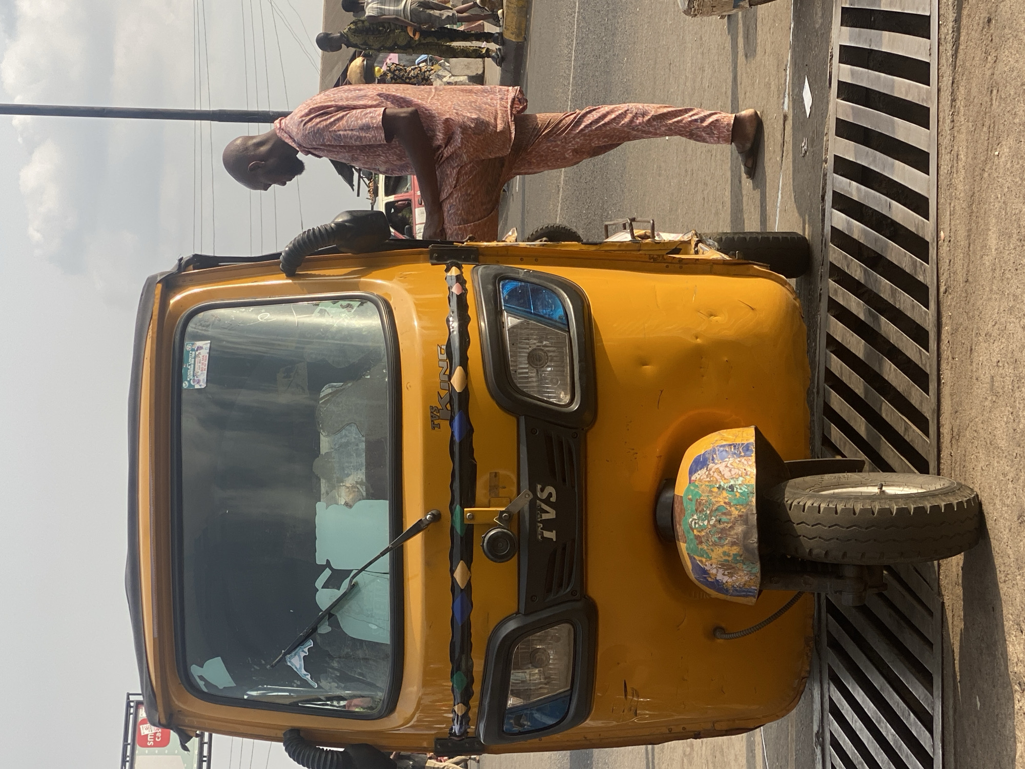 A bald man with a beard, wearing a salmon-pink patterned short-sleeved shirt and matching trousers, stands adjacent to a bright yellow TVS King tricycle on an urban street in Ibadan, Nigeria. The man is leaning against the tricycle's right side, with his left foot elevated and resting on the vehicle's body, while his right foot, clad in a brown sandal, is positioned on the concrete ground. The tricycle, facing the viewer, presents a single front wheel with a distinctively multi-colored painted mudguard and a black decorative strip with colored inserts above its headlights. A metal drainage grate featuring parallel diagonal bars occupies the immediate foreground. The background reveals a street with other pedestrians and partially visible vehicles, including a red car, under a hazy sky containing visible power lines and a utility pole. A distant billboard with the partial text "SM cas" is discernible. The scene is illuminated by bright daylight, casting defined shadows, indicative of an active urban environment.