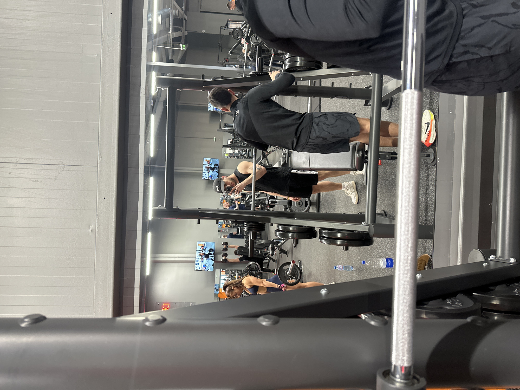 The image depicts a gym interior with multiple people engaged in various exercises