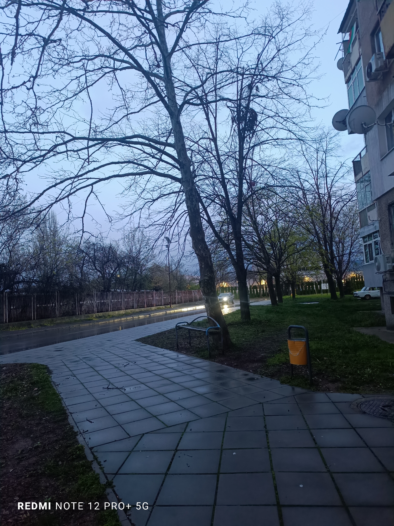 The image depicts a street scene in Targovishte, Bulgaria at dusk. A tiled sidewalk stretches from the lower left to the center of the frame. A street runs parallel to the sidewalk, with a fence and various trees lining the opposite side. Several bare trees are visible in the foreground and middle ground. A yellow trash can stands next to the sidewalk on a patch of grass. A car with headlights on is visible on the street in the middle ground. An apartment building with satellite dishes attached to its facade is seen on the right side of the frame. The sky is overcast. "REDMI NOTE 12 PRO+ 5G" is printed in the lower left corner of the image.