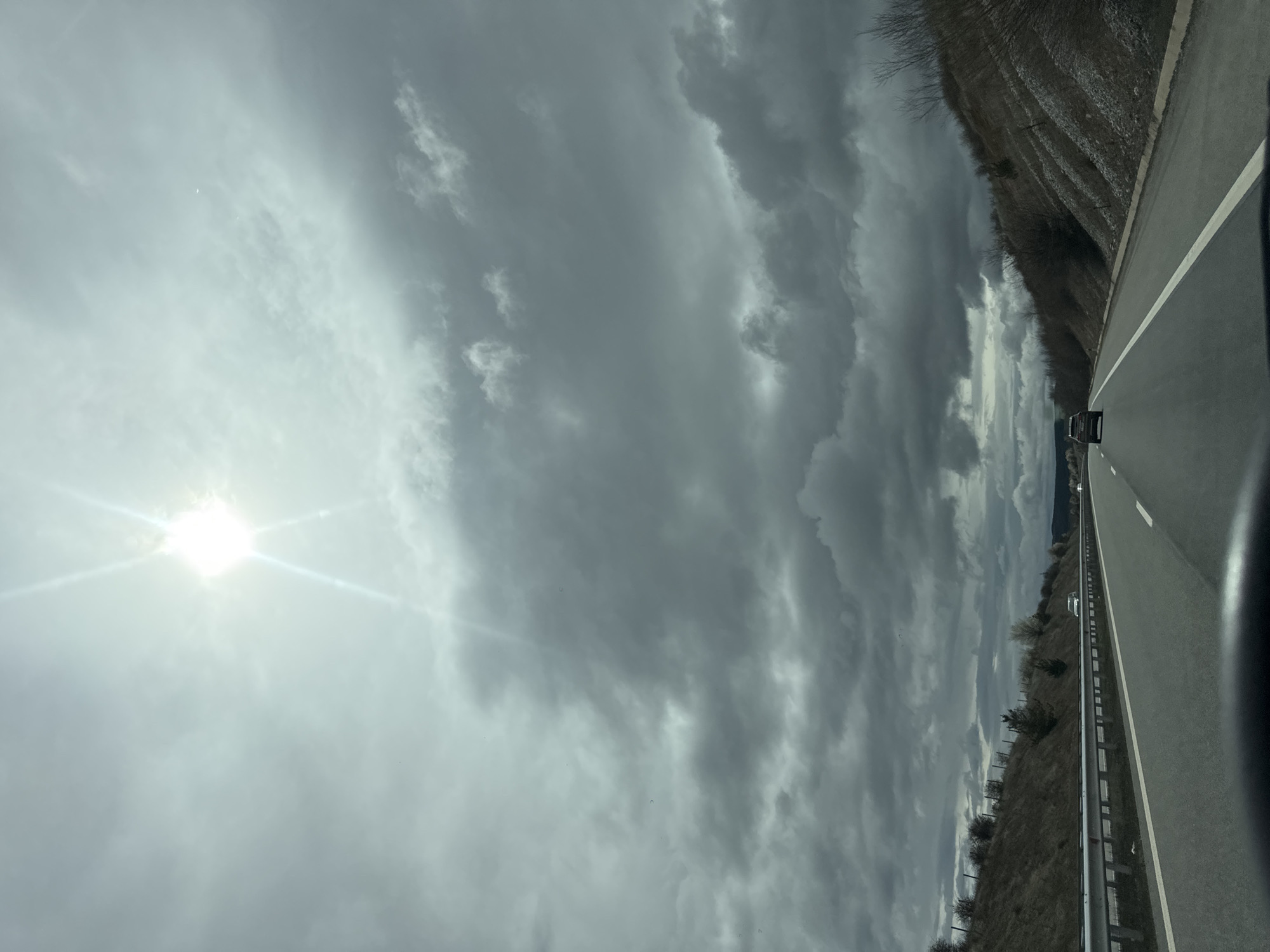 The image depicts a view from a vehicle traveling on a highway near Dyakovo, Bulgaria. The sky is overcast with gray clouds and a bright sun visible through the clouds on the left. A guardrail lines the side of the road, beyond which is a grassy slope. The road surface appears to be asphalt with white lane markings. Other vehicles are visible in the distance on the highway. The image is oriented such that the sky occupies the majority of the view.