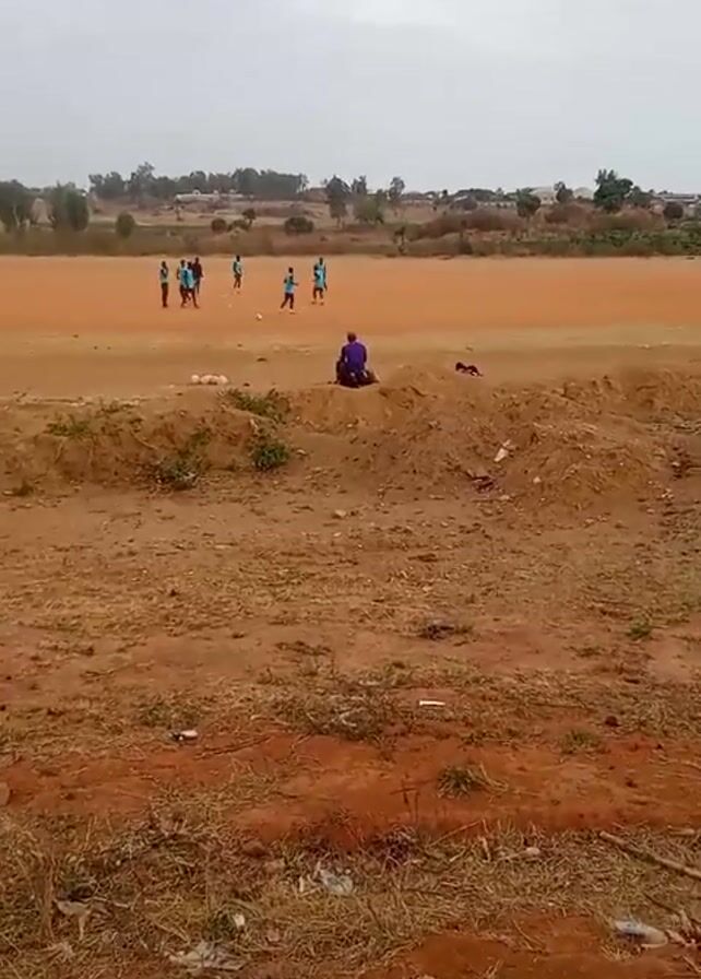 The scene depicts a group of young men training on a dry, reddish-brown soccer field under an overcast sky