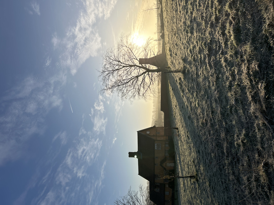 The image depicts an early morning rural landscape in East Suffolk, United Kingdom, under a clear, pale blue sky with scattered cirrus clouds. A low sun on the right horizon casts prominent, elongated shadows diagonally across a frost-covered grassy field that occupies the foreground and midground. On the left side of the midground stands a two-story, light brown or yellowish house featuring a distinctive central chimney and multiple gables. A dark, low wall extends from the house towards the center of the frame. Centered slightly to the right of the wall, a bare-branched deciduous tree is silhouetted against the bright sunlight. Immediately behind and to the right of this tree, a brick kiln, characterized by its tall, conical structure and chimney, is also silhouetted. The background features a hazy, sunlit distant landscape, and a single aircraft contrail is visible in the upper sky. No individuals are present in the scene.