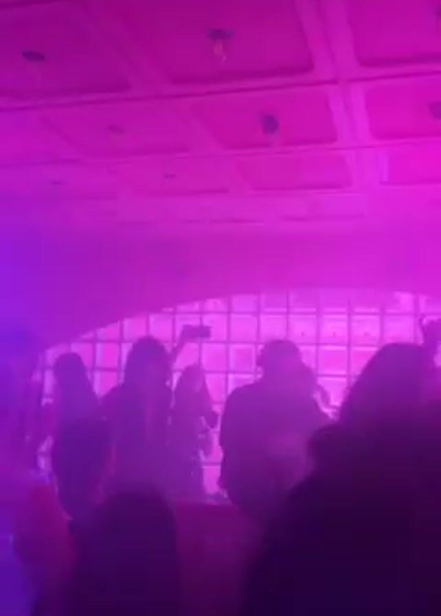 The video depicts a crowded, dimly lit indoor space, possibly a club or event venue, illuminated by a strong pink lighting scheme. Silhouetted figures of people are visible, suggesting they are facing a stage or focal point. The ceiling features a grid-like pattern, with lighting fixtures sparsely distributed. The overall atmosphere implies a lively, social gathering with a focus on music and entertainment.