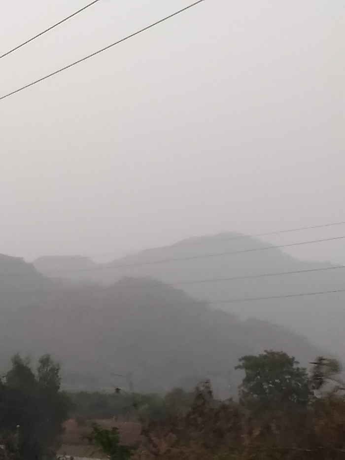 This image depicts a hazy, mountainous landscape in Dorowa, Nigeria, under an overcast sky. The upper portion of the frame is dominated by a light grey sky with severely reduced visibility. Multiple layers of mountains, appearing as dark grey silhouettes, recede into the distance across the middle ground, their peaks indistinct due to atmospheric conditions (e.g., fog, mist, or haze). Three to four dark, thin utility lines traverse horizontally across the upper-middle and middle sections of the image. The foreground displays dark green and brown vegetation, including trees and shrubs, with indistinct ground features visible beneath them. No people, discernible subjects, or specific actions are observed.