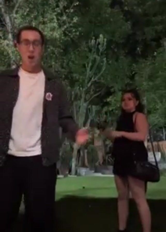 At night, a man and a woman are dancing on a grassy lawn. The man wears black pants, a white t-shirt, a black overshirt with white dots, and glasses. The woman wears a black mini dress, black boots, and a black shoulder bag. They are in front of trees and a patch of greenery. They appear to be enjoying themselves as they dance.