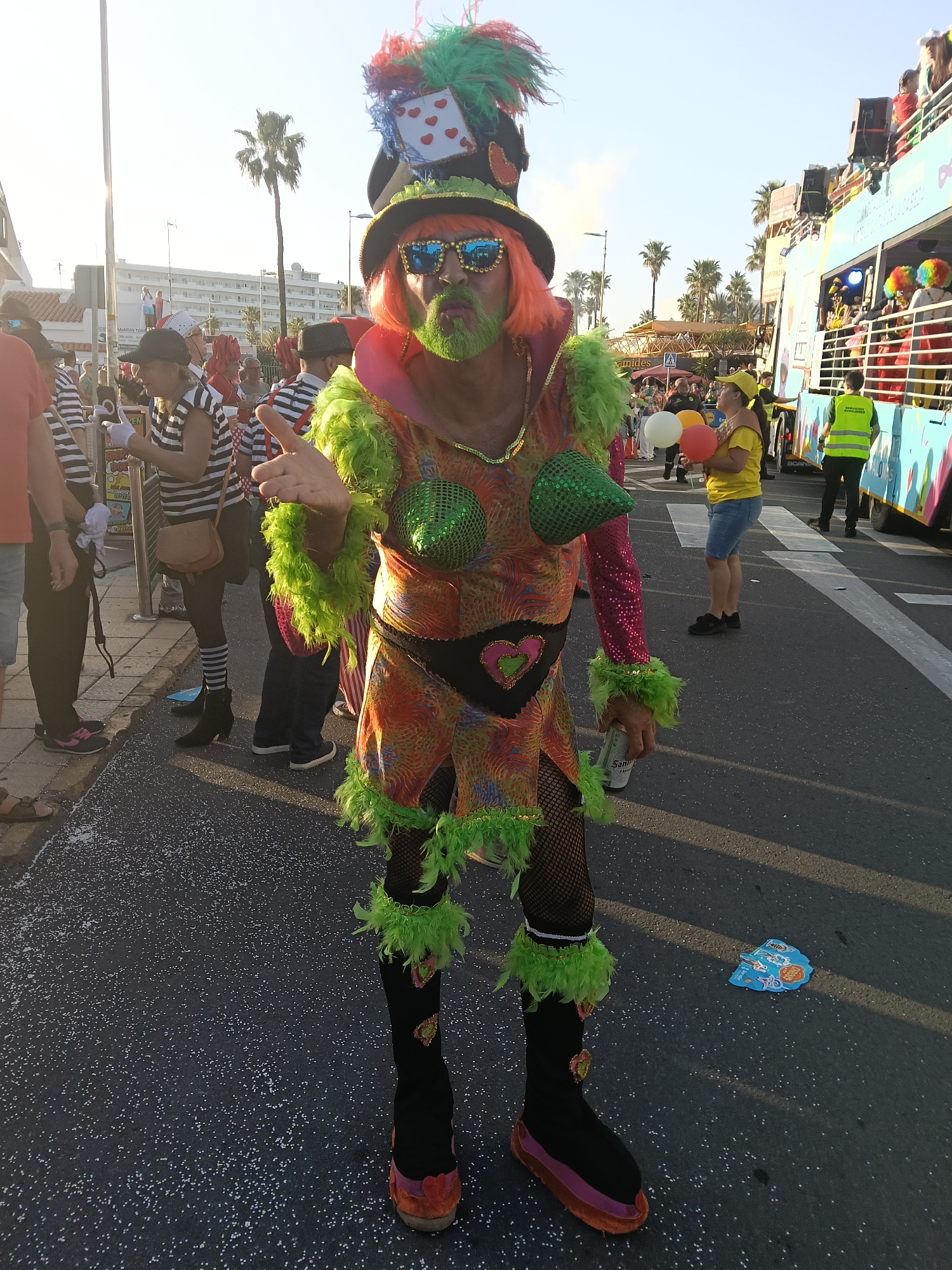 A person in a flamboyant carnival costume stands in the street in Playa Del Inglés, Spain. The individual has a green painted beard and is wearing reflective sunglasses, a tall black hat adorned with colorful feathers and playing card motifs, and a multi-colored costume with green sequined breast coverings and green feathered trim. They are holding a can of beer. The street is littered with confetti. Behind them, other carnival participants and spectators are visible, along with a decorated float and a yellow-vested individual seemingly involved in event management. Buildings and palm trees are in the background. The scene suggests a lively and festive event.