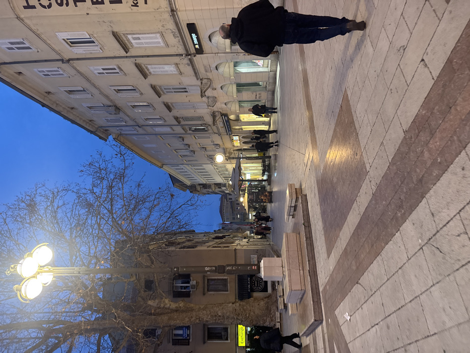This image depicts a pedestrian thoroughfare at dusk or early night within Grad Rijeka, Croatia, likely a section of Korzo or a connecting square such as Trg Ivana Koblera