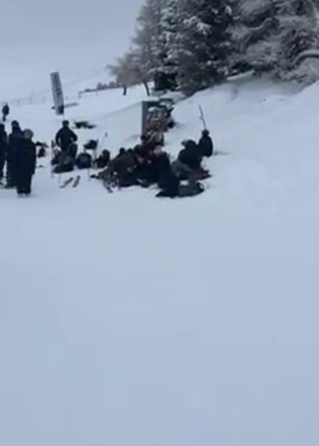 The video depicts a snowy ski area under a cloudy sky. A group of people, bundled in winter clothing, are gathered at the side of a ski slope, some sitting and others standing. Ski equipment, including skis and poles, is scattered around the group. The camera focuses on a person standing on skis, wearing a helmet, a gray hoodie, and green pants, holding ski poles. The camera then pans upwards to show the ski slope, bordered by orange safety netting, leading up to a line of snow-covered trees and a landscape of clouds in the distance. Other skiers are visible further up the slope.
