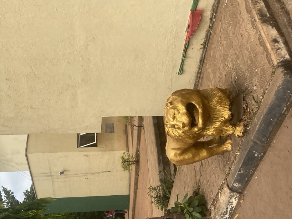 The image displays an outdoor scene in Nsukka, Nigeria, likely within the University of Nigeria, Nsukka campus. The central subject is a golden-painted lion statue, depicted in a standing posture with an open mouth, positioned on a raised, patterned concrete walkway. A dark grey concrete curb separates this walkway from a reddish-brown dirt or gravel path in the immediate foreground. Behind the statue, the paved area continues, featuring scattered small green shrubs and other foliage. In the background, a complex of multi-story buildings with predominantly cream-colored exteriors is visible. The leftmost building section includes a vertical dark green panel. On a central cream-colored wall, a white-framed window is open outwards, and a dark rectangular plaque or sign is affixed beneath it. A security light fixture is mounted higher on the wall. Two individuals, one wearing a red top, are partially visible walking in the far left background near the green building section. The right side of the frame is dominated by a large, plain cream-colored wall, near the base of which a piece of red fabric is draped over a horizontal green strip or pipe. The sky in the upper left corner appears overcast.