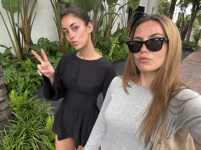 This outdoor photograph depicts two young adult females posing in Miami Beach, United States