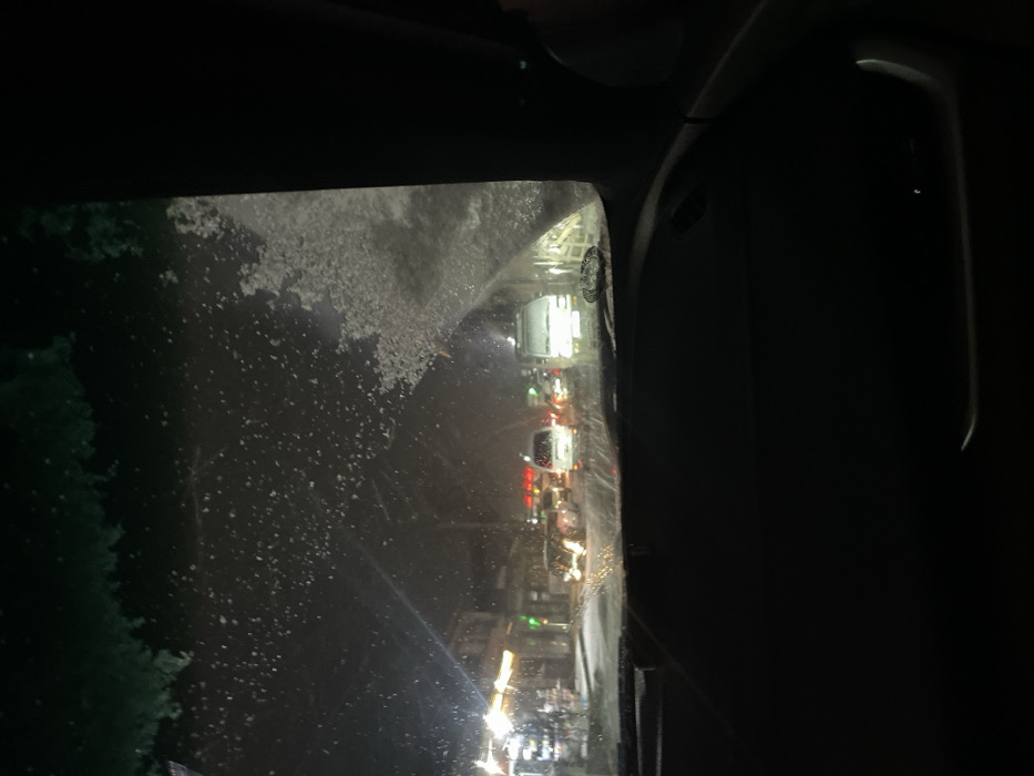 Captured from inside a car, the image depicts a dimly lit, nighttime scene through a snow-flecked windshield
