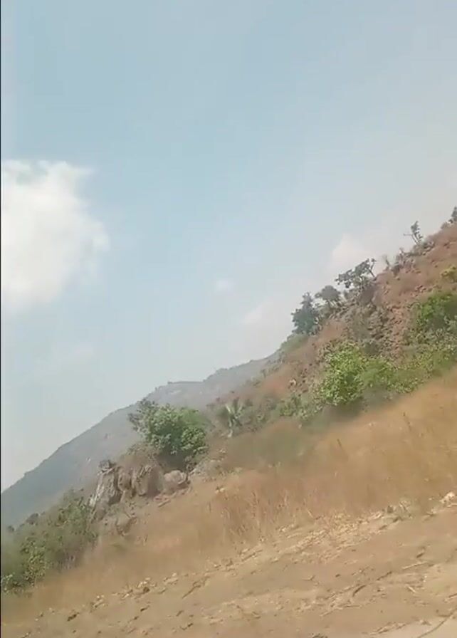 roadside view of a hilly landscape under a sky with light, scattered clouds. The camera is likely mounted inside a vehicle, capturing the passing scenery. Vegetation on the hills is mostly dry brown grass interspersed with patches of green trees. As the vehicle progresses, power lines can be seen in the background near the hilltops. The road is asphalt. The landscape has a somewhat barren appearance, with the brown vegetation dominating the scenery.
